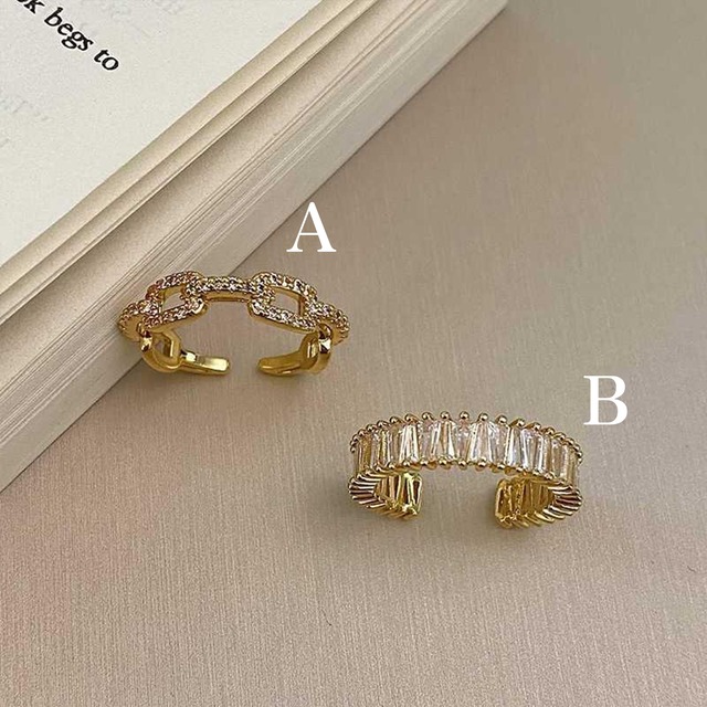 ※必ず注意事項を御一読下さい。 デザイン性のある高品質クリアビジューリング A: チェーンモチーフのオープンリング B: レクタングル型ビジューをふんだんに使用したエタニティリング サイズ:フリーサイズ(オープンリング) 素材:合金
