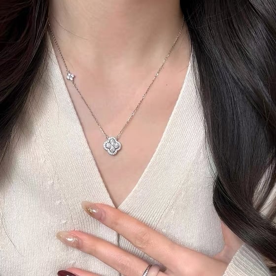 四つ葉のクローバーモチーフのパヴェダイヤモンドを贅沢にセッティングしたネックレス。幸運を呼ぶシンボルと華やかさと可憐さを兼ね備えたデザインです。チェーン部分に小さなモチーフをあしらっており、アシンメトリーで遊び心ある仕上がりです。