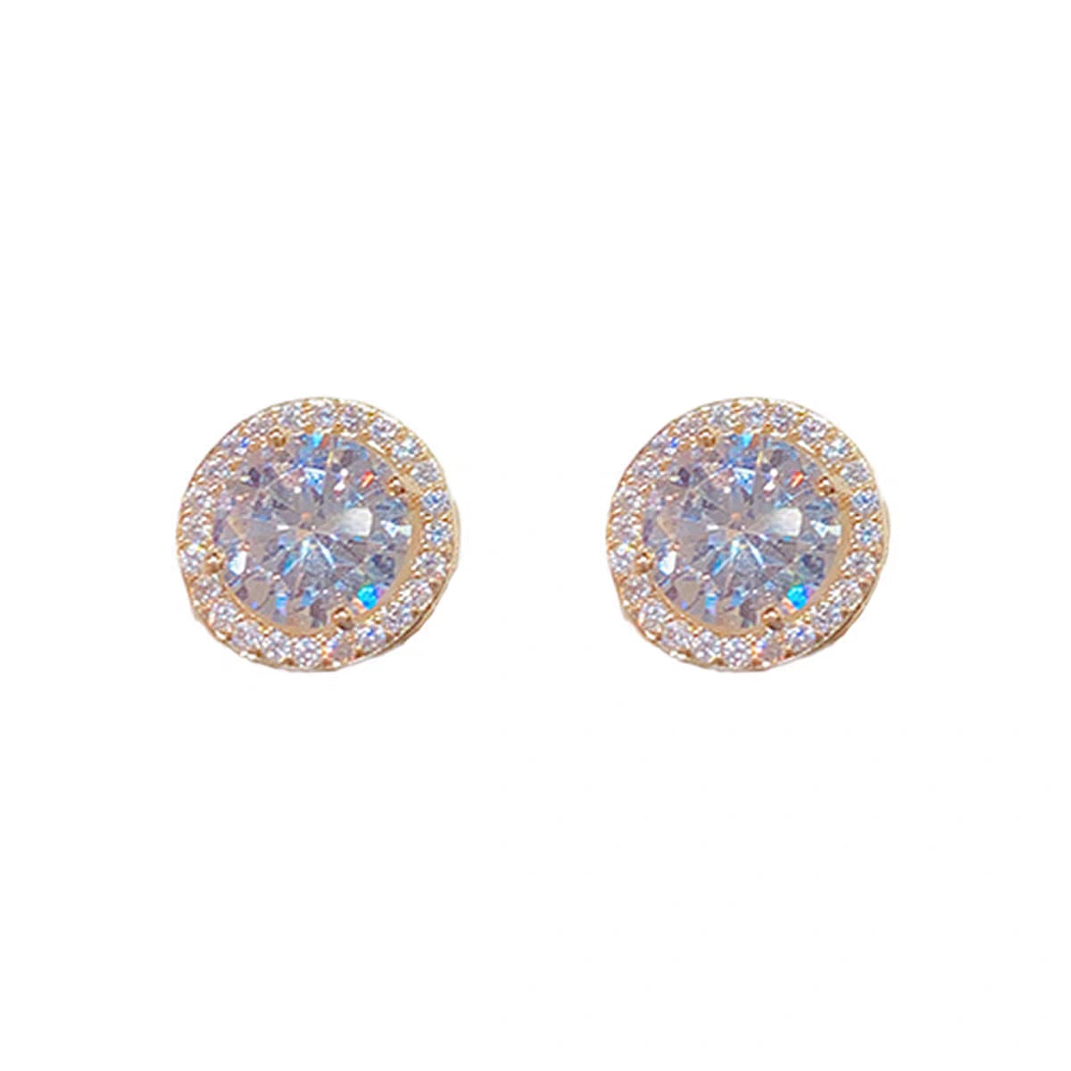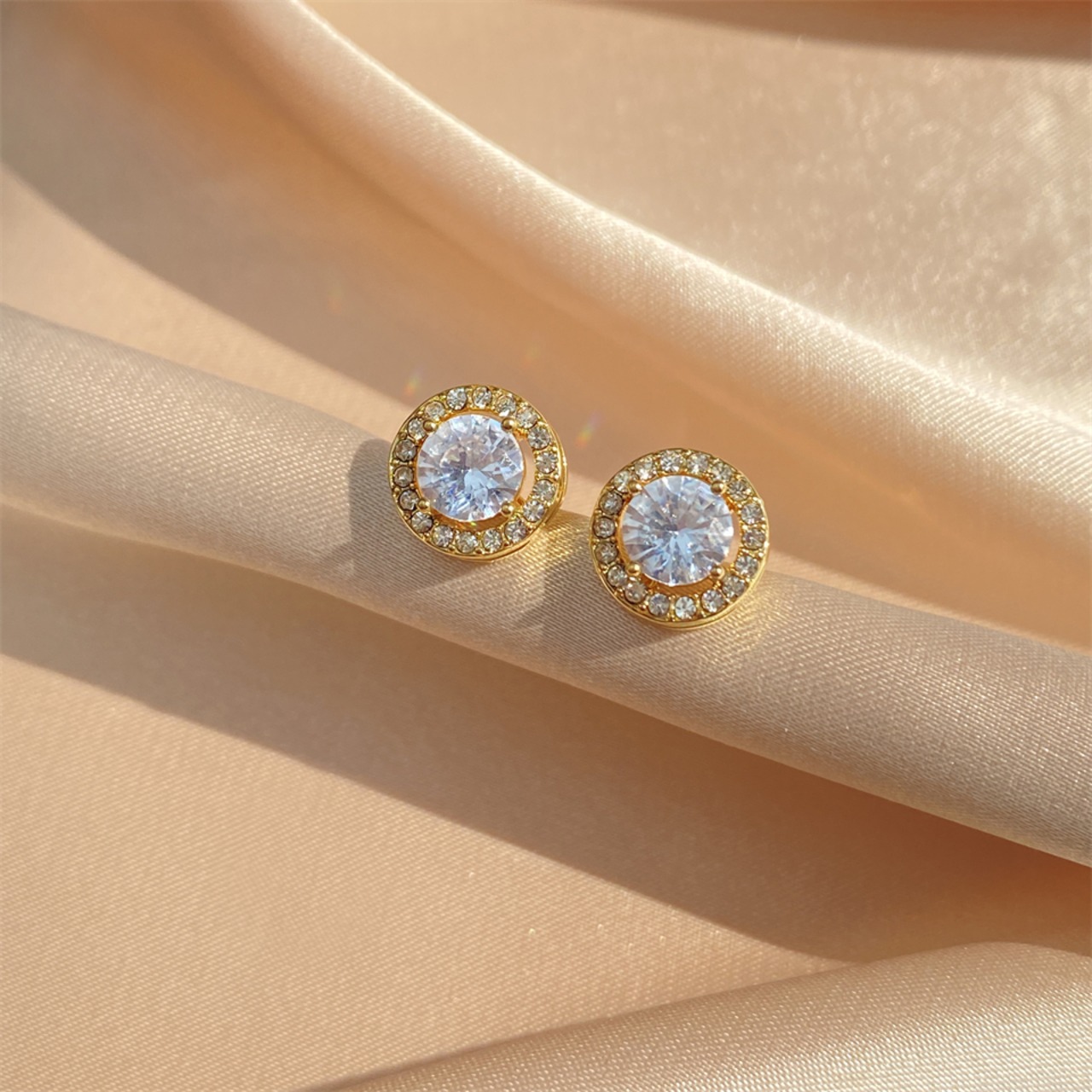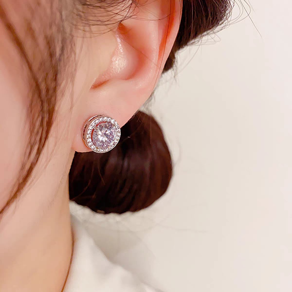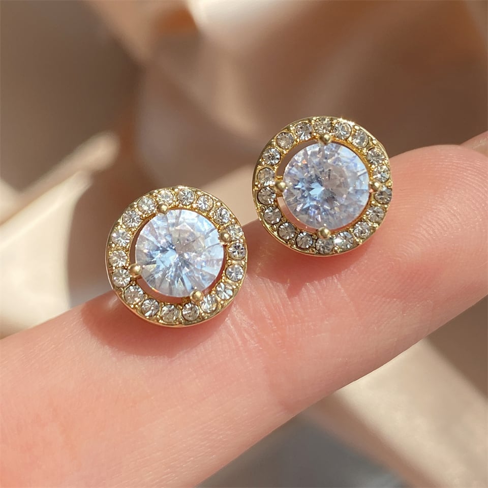 繊細な輝きを放つラウンドカットストーンを、華やかな小粒ストーンで囲んだ上品なデザインのピアス。