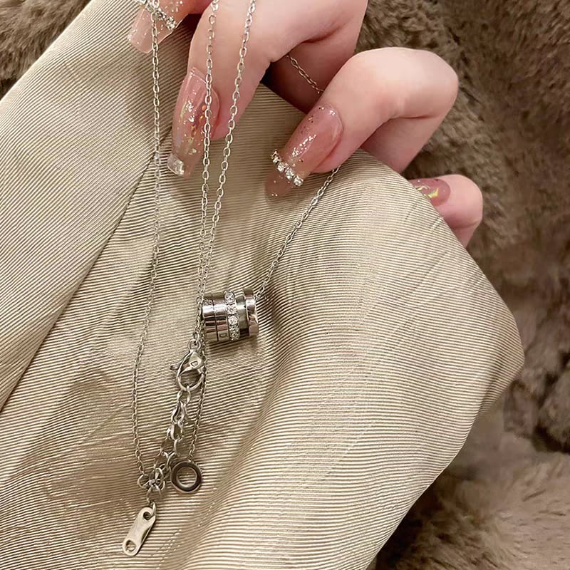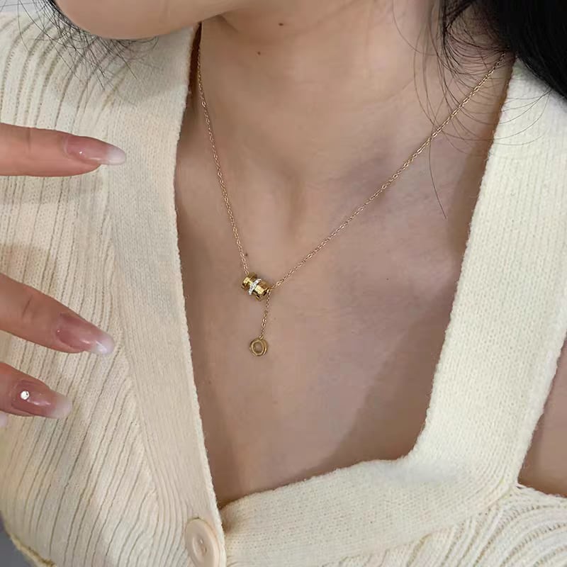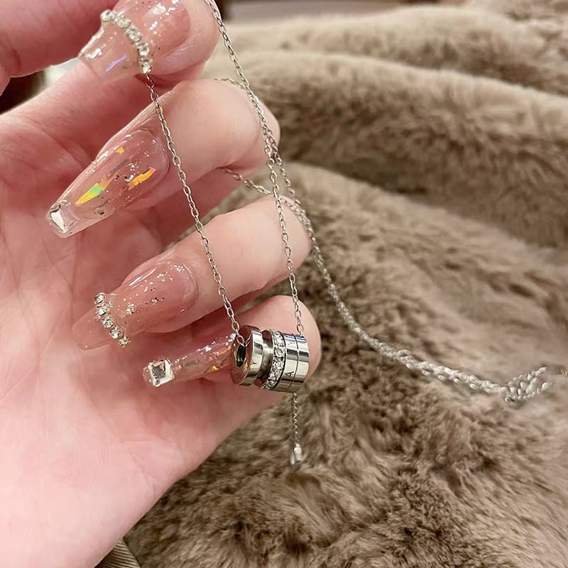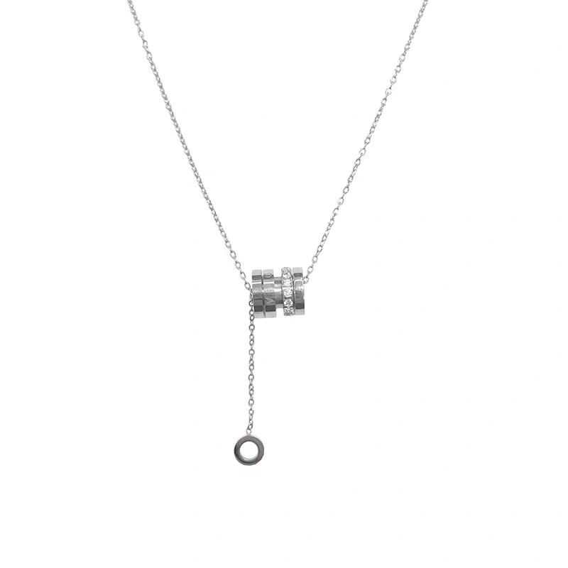 シルバーの輝きが上品な印象を与える、リングモチーフデザインのネックレス。中央には3連のリングがあしらわれ、うち1つにはクリアストーンを贅沢に配置。動くたびに繊細な輝きを放ち、首元を華やかに演出します。下に垂れるチェーンが女性らしさと抜け感をプラスし、シンプルながら存在感のある仕上がりに。