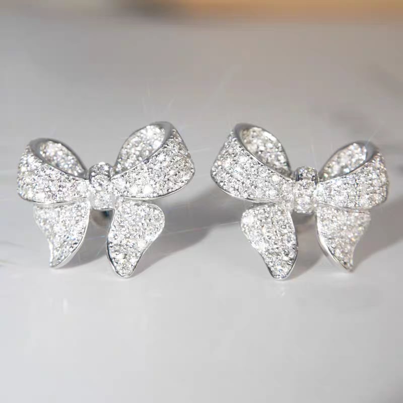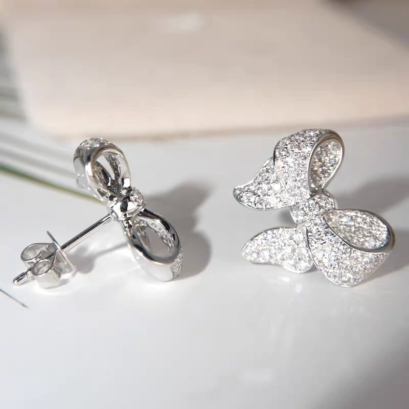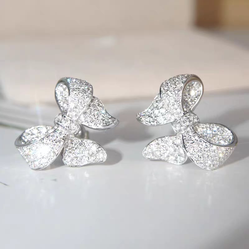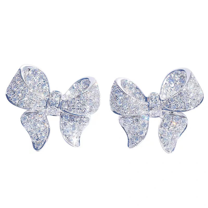 繊細なストーンを贅沢に敷き詰めた、立体的なリボンモチーフのピアス。