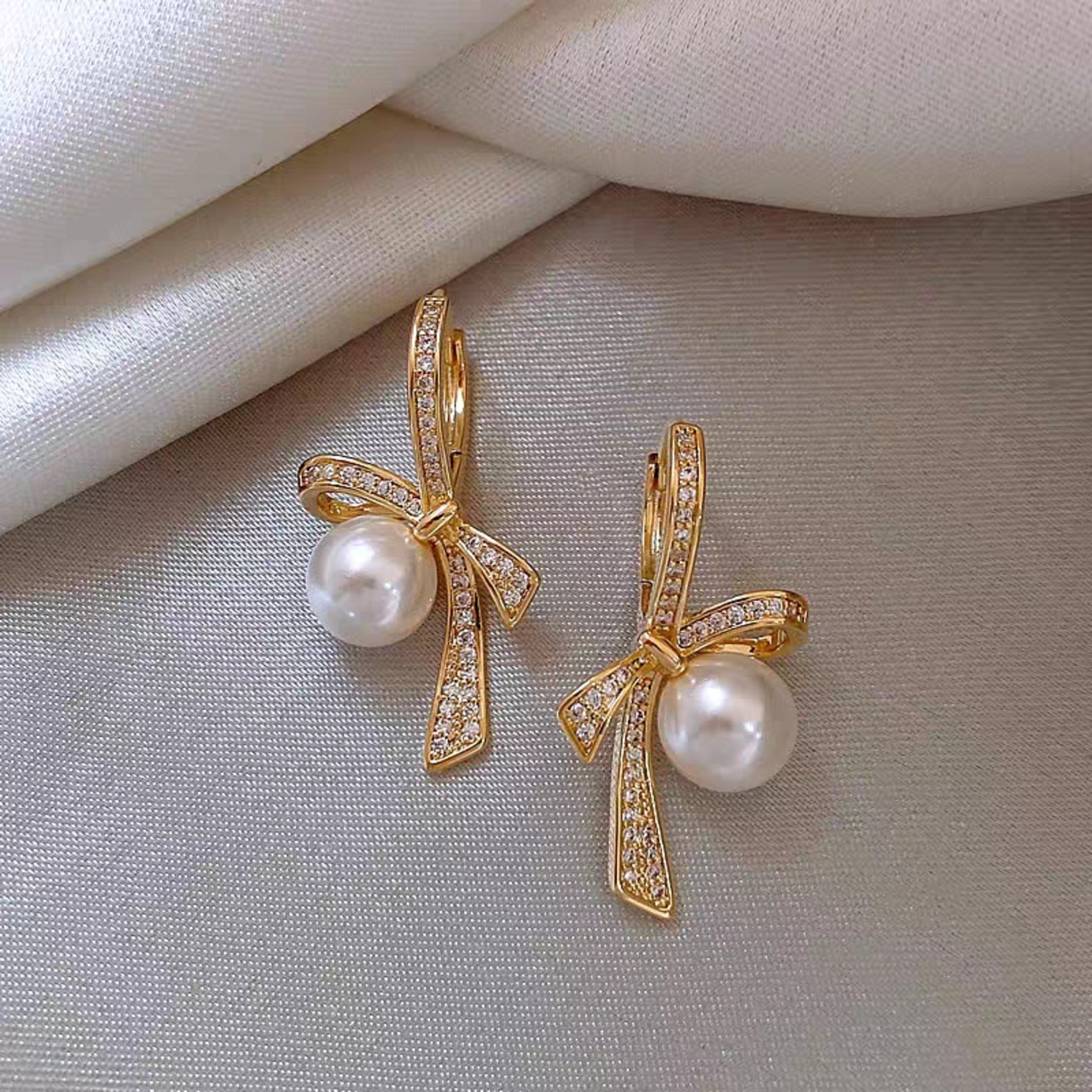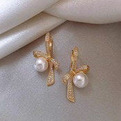 高品質ビジューと上品な1粒パールを使用したリボンモチーフピアスです。
