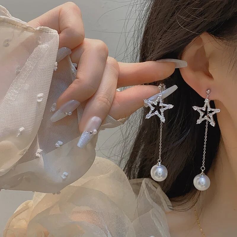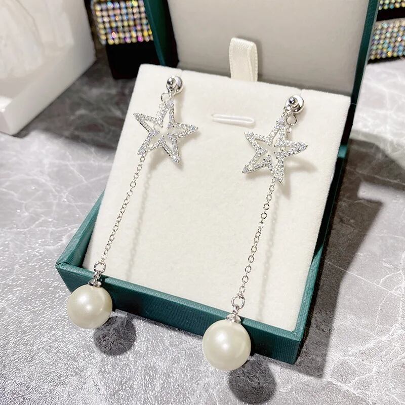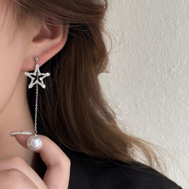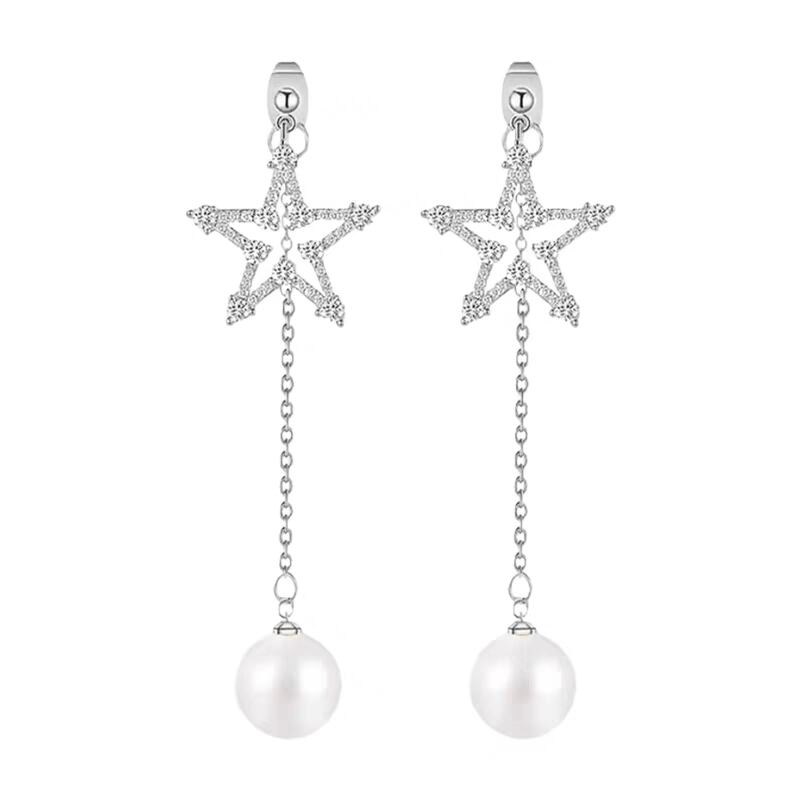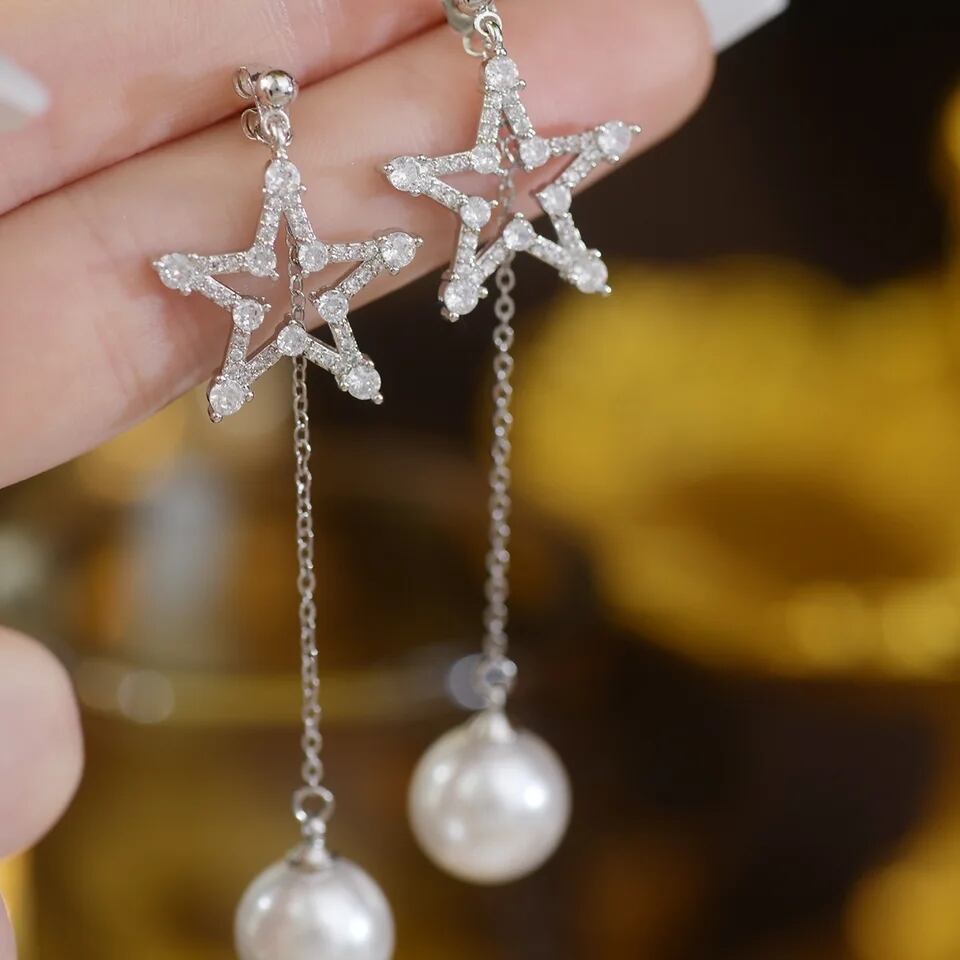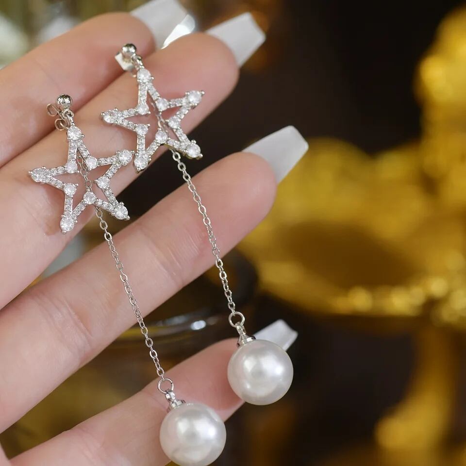 キュービックジルコニア輝くシルバースターモチーフに、1粒パールが揺れる存在感のあるデザインです。